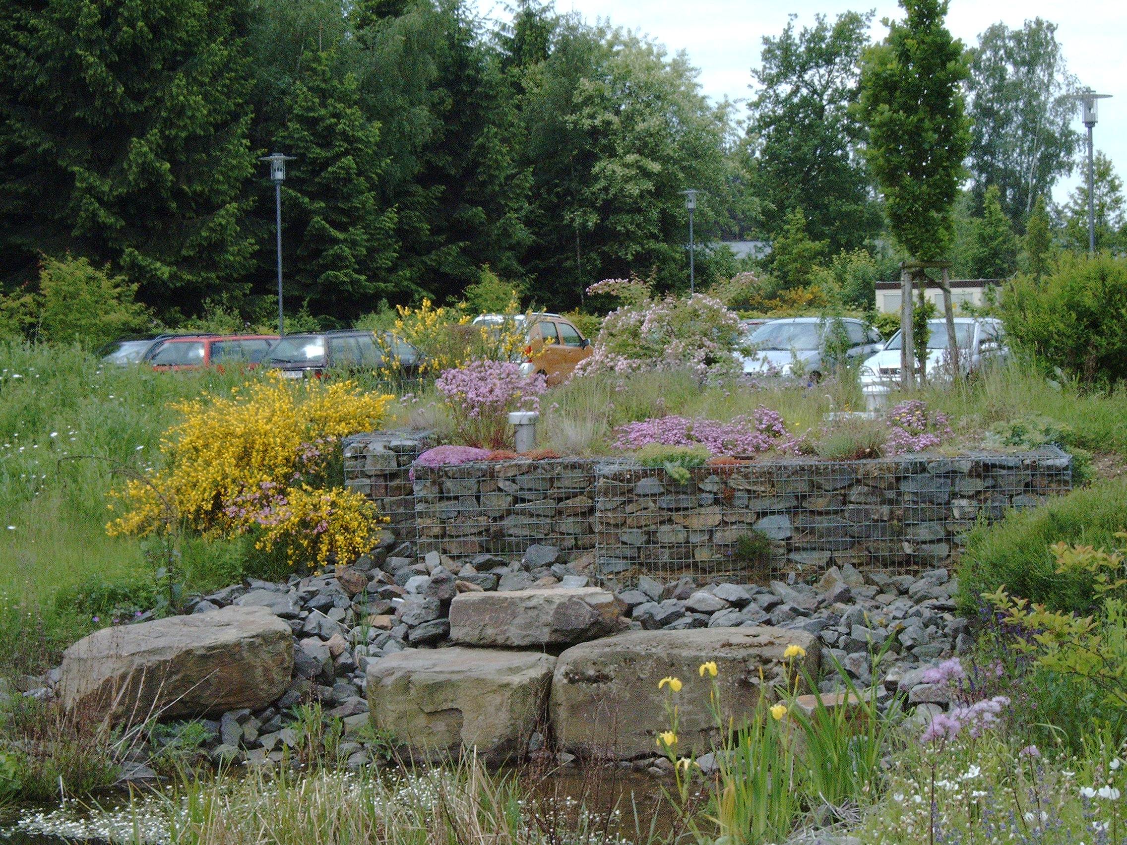 Zur Überbrückung der Höhendifferenzen zur Straße haben wir gefüllte Drahtschotterkörbe, die zusätzlich extensiv begrünt wurden, eingesetzt und die Mitarbeiterparkplätze wurden in wasserdurchlässiger und begrünter Bauart hergestellt.